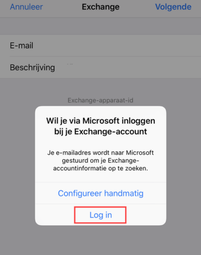 U krijgt in de volgende stap de vraag of u wilt handmatig uw mailbox wilt configureren of wilt inloggen. Kies voor “Log in”