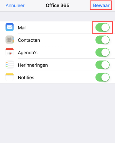 U krijgt vervolgens de vraag welke opties u wilt gebruiken voor synchronisatie. Zorg er in ieder geval voor dat u ten alle tijden ‘Mail’ heeft ingeschakeld. Klik op ‘Bewaar’ om de mailbox toevoeging te voltooien.