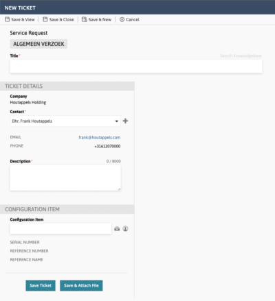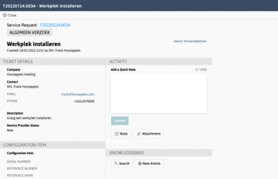 In dit nieuwe ticket geef je de ticket een naam bijvoorbeeld “Installatie nieuwe werkplek Piet” Vervolgens kun je van je eigen organisatie een contactpersoon kiezen met wie wij deze werkzaamheden dienen te plannen. Bij de “Description” oftewel omschrijving geef je aan wat dient te gebeuren en wanneer. Bijvoorbeeld; “Graag nieuwe werkplek Piet installeren deze dient ingericht te worden als een administratie werkplek”. Indien er een datum gewenst is kun je deze meteen opgeven.